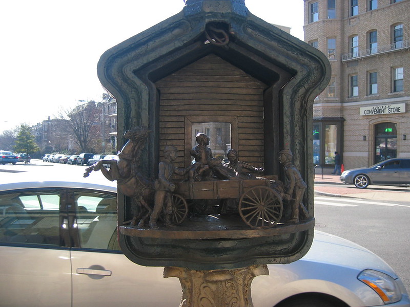 This is one of those old fire alarm pull boxes that has been converted into a sculpture. I’ve seen many of these alarm boxes converted into paintings but this is the first sculpture I’ve seen. This one is located in Mt. Pleasant and apparently is showing some troops being taken to the old Mt. Pleasant Hospital. Really an amazing conversion, no? Check out another picture after the jump.