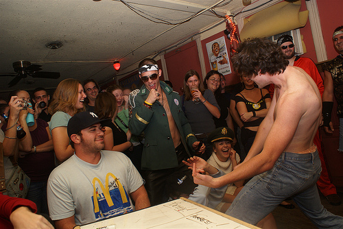 Baltimore’s Lance Karsten (a.k.a. The Shred) walked away the winner and Tim Granlund (a.k.a. The Six String General) may or may not be getting the lay of his life after shoving his tongue down the throat of a very cute blonde in the middle of his final round performance. The General took second place, with Kolb Ettenger (a.k.a. Vlad D.M. Wailer) placing third.”