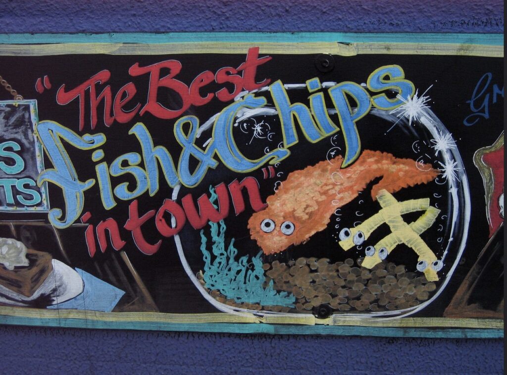 “I don’t know if this qualifies as a sweet city sign, and maybe you’ve shown it before, but I just love the mural of the giant fish leaping in the air. I couldn’t fit it in the pic, but directly to the left of the lettering is the painting of the smaller fish. Not as well depicted, but endearing in its own way. The building is located on the Southwest corner of P and 14th. And then just to keep with the fish theme, I thought I’d include an international sweet city sign, from the Notting Hill area of London.”