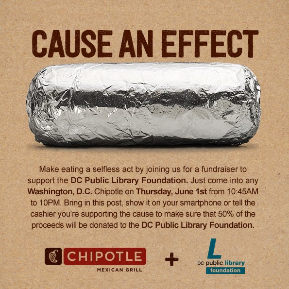 “On Thursday, June 1 from 10:45 a.m. to 10 p.m., Chipotle Mexican Grill will host a fundraiser across all D.C. Chipotle locations to support the D.C. Public Library Foundation. When customers dine at any of these locations and mention the fundraiser at the register, Chipotle will donate 50 percent of the proceeds to the D.C. Public Library summer reading program.