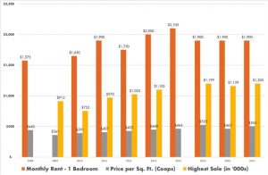Overall, had you purchased a coop you only would have seen a 1.4% increase annually since 2008, but the townhouse values have increased by about 3.4% annually. Rental rates have remained fairly steady since 2013 in contrast to other parts of the city where they have been on the decline.