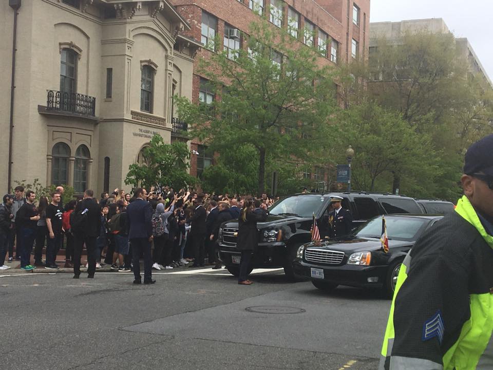 “He walked along all four corners of G St & 21st and shook hands and spoke with GW students. He was accompanied by Rep. John Lewis.”