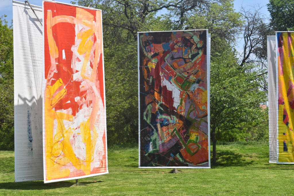 The water-based paintings are painted on a special vinyl. The vinyl is designed to resist external exposure from sunlight and harsh weather conditions. Each painting is stretched on a structure especially built for this purpose.”