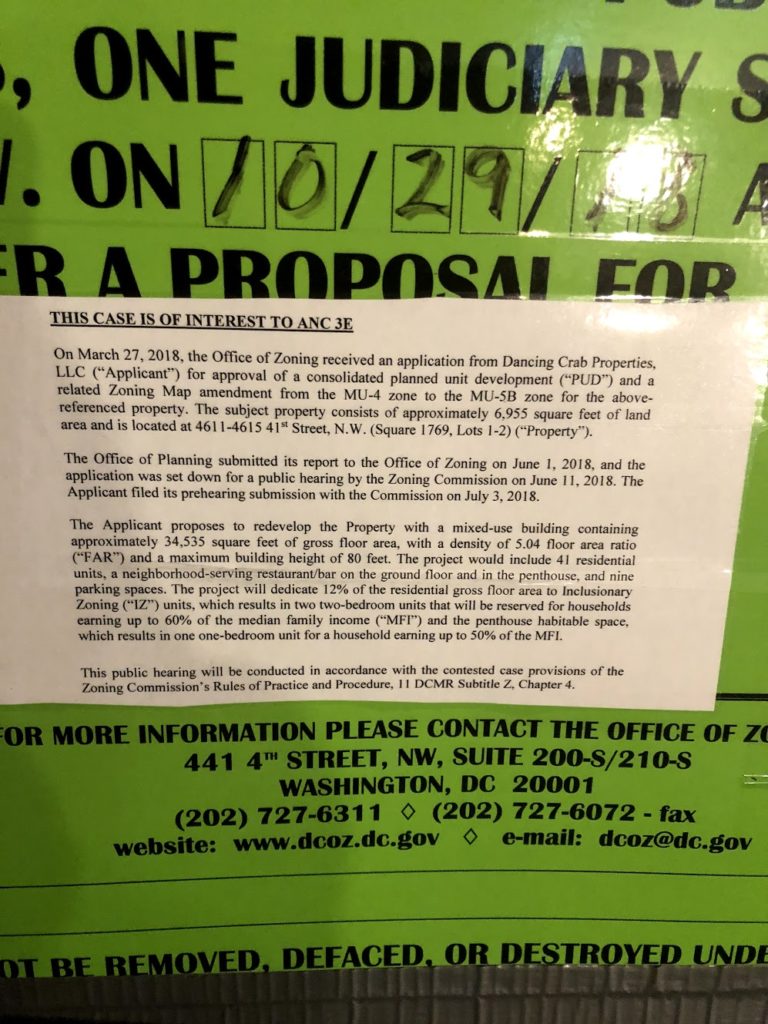 I walked by the former Dancing Crab building last night and noticed there is a proposal for a zone change from MU-4 to MU-5B to allow for a 80 foot building. Checked the ANC 3E website for more info, and there’s a resolution in support of this zone change, provided the developer provides “amenities” to the neighborhood.