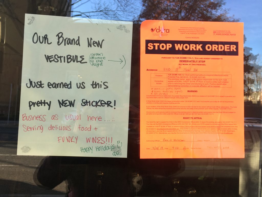 “Queen’s English got a stop work order after their new vestibule was installed on Sunday morning. Gotta at least love the positive attitude about their sticker! But the real question is how did someone get someone from DCRA to come out at 9:26 am on a Sunday? I’ve put in illegal construction requests for bricks falling during business hours and months later got a closed notification email and a “how did we do?” survey request.”