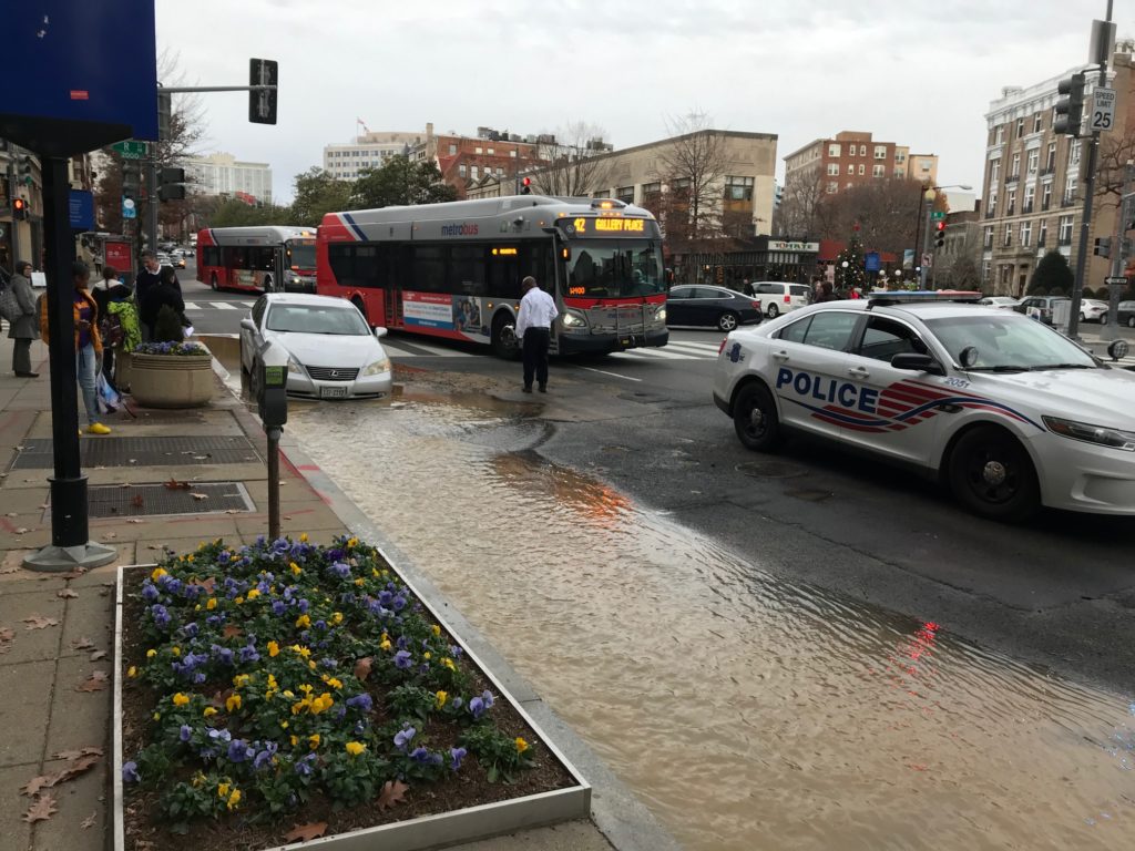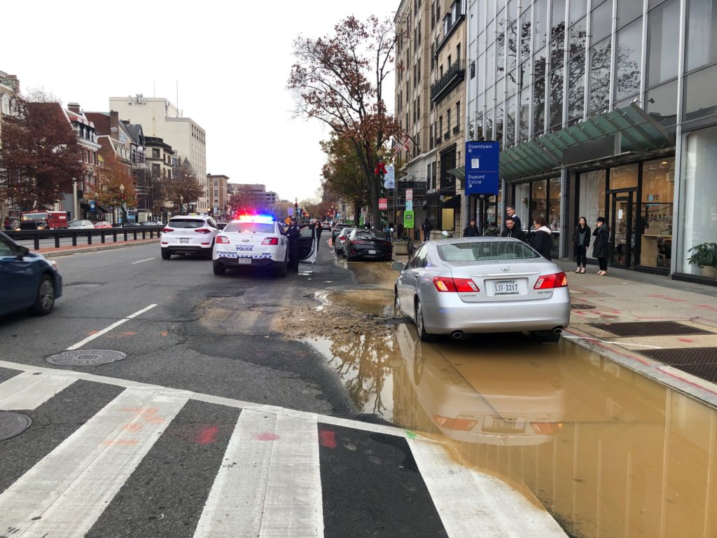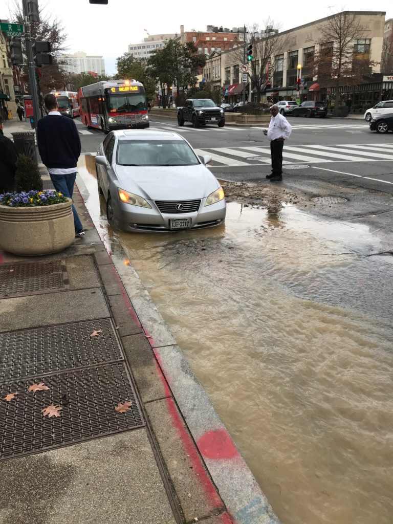 Yikes, thanks to Ian for sending from just north of Dupont Circle: “Water main break. Car seems to be in sink hole of sorts. Water gushing all down Connecticut Avenue”