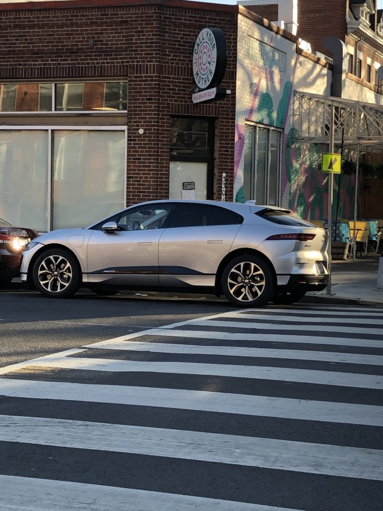 Thanks to Adam for sending the shot above: “Mind blown, the new Jaguar I-PACE parked in front of Call Your Mother at 8:00am on Sunday! I had not previously heard of it or seen it, and it looked like a spaceship as I crossed the street (stopping to gawk caused me to be second in line for bagels instead of first). An electric car partially parked in the crosswalk… concerned about the environment, but less so the rule of law.”