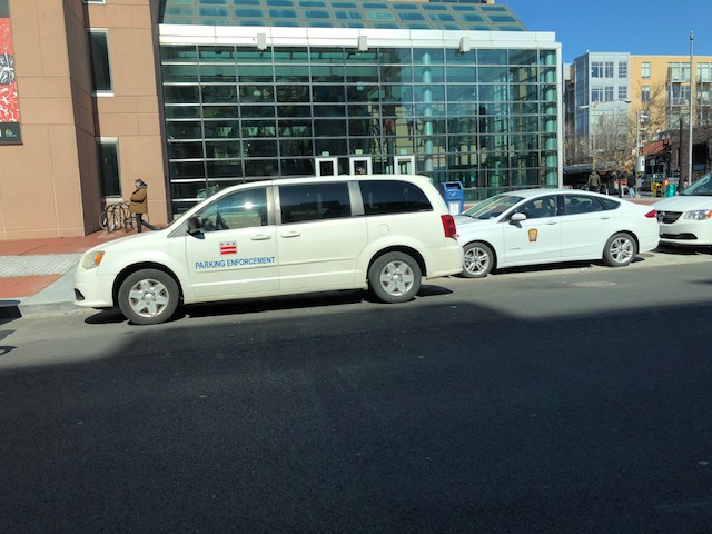 “A DC Parking enforcement van poorly/illegally parked on U st. Nw in front of a dc fire/ems car.”