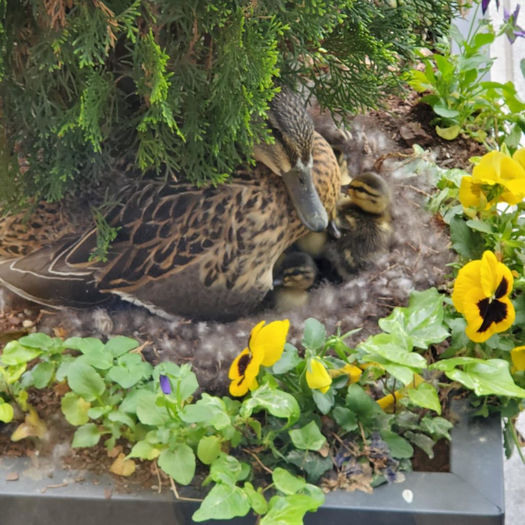 A mother duck made a nest in a planter outside of our office during the quarantine. Yesterday, 10 ducklings hatched. We were concerned about the duck family navigating through traffic to find water, so we contacted Duck Watch.