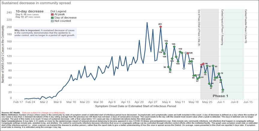 The District has experienced 10 days of sustained decrease in community spread of COVID-19 during Phase One. That data is represented in the chart below.