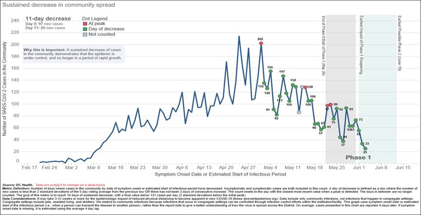 The District has experienced 11 days of sustained decrease in community spread of COVID-19 during Phase One. That data is represented in the chart below.”