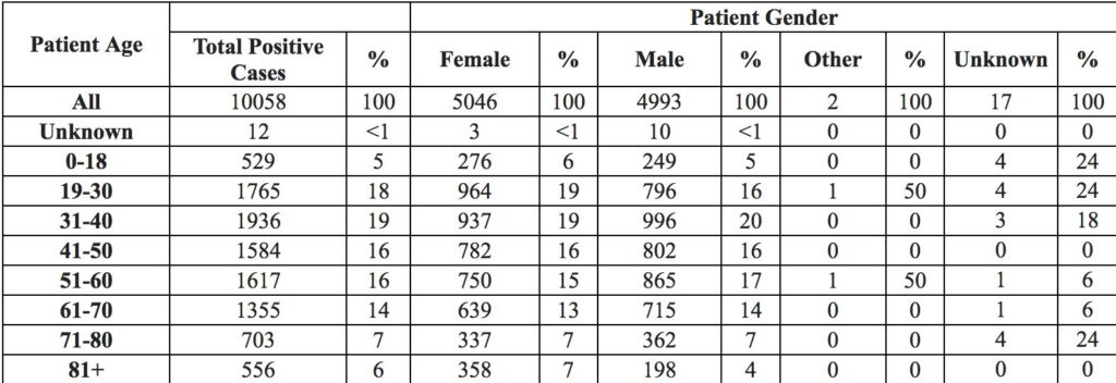 Below is the District’s aggregated total of positive COVID-19 cases, sorted by age and gender.”