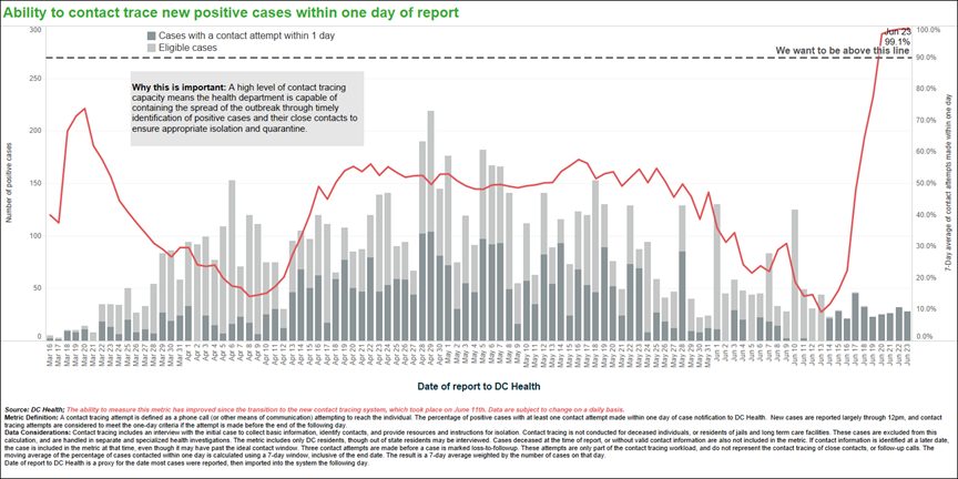 The District has the ability to contact trace 99.1% of new cases within one day of report. That data is represented in the chart below.