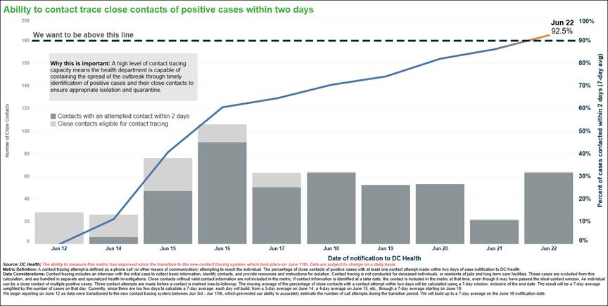 The District has the ability to contact trace 92.5% of close contacts of positive cases within two days. That data is represented in the chart below.