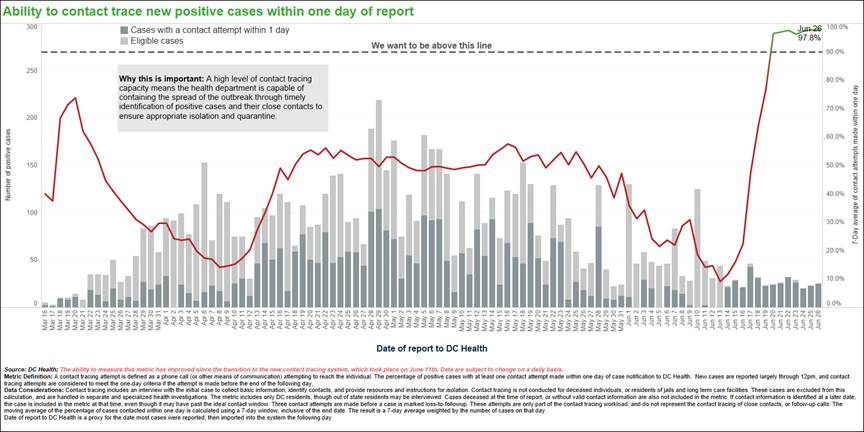 The District has the ability to contact trace 97.8% of new cases within on day of report. That data is represented in the chart below.