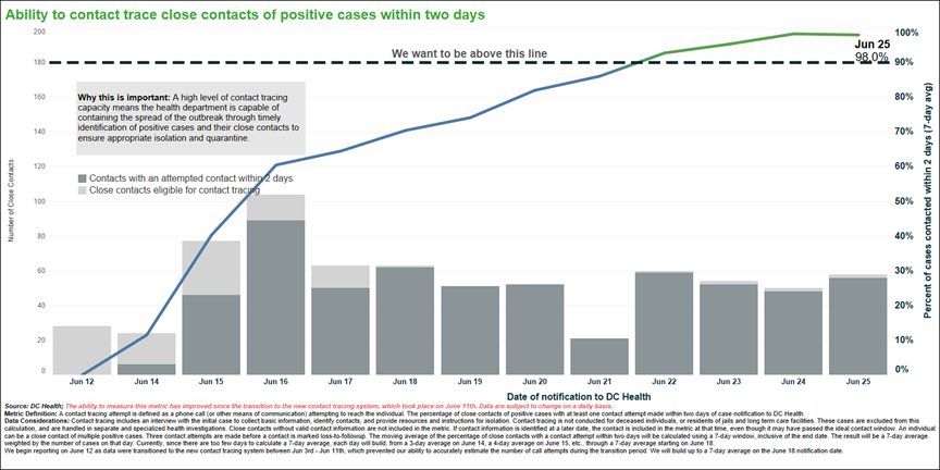 The District has the ability to contact trace 98.0% of close contacts of positive cases within two days. That data is represented in the chart below.