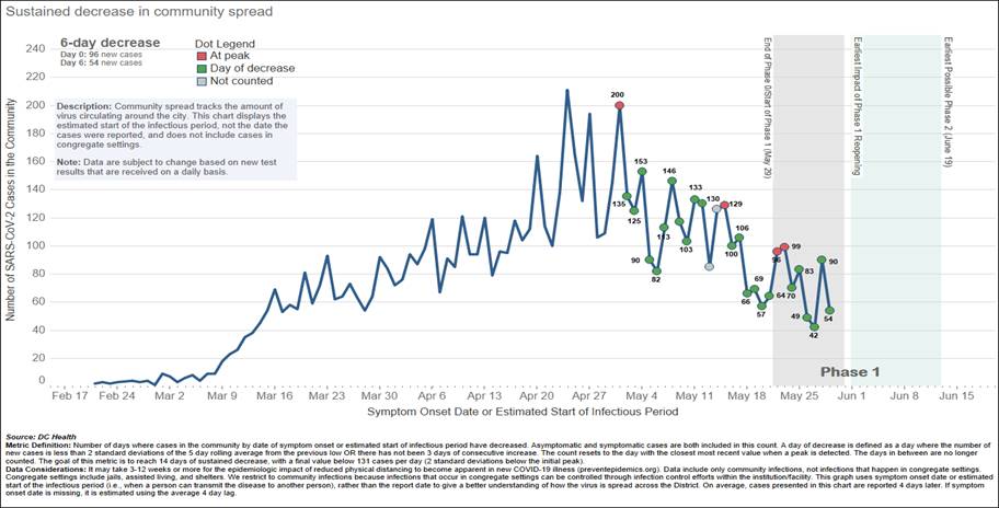 The District has reached six days of sustained decrease in community spread of COVID-19 during Phase One. That data is represented in the chart below.”