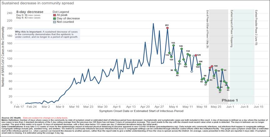 The District has reached eight days of sustained decrease in community spread of COVID-19 during Phase One. That data is represented in the chart below.”