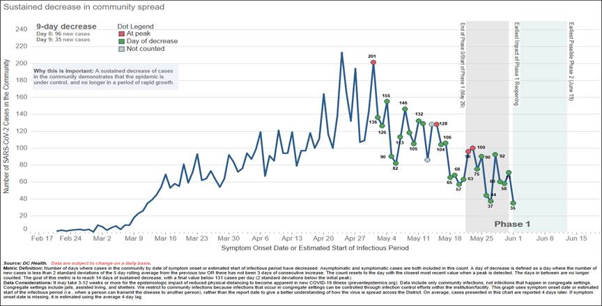 The District has experienced nine days of sustained decrease in community spread of COVID-19 During Phase One. That data is represented in the chart below.”