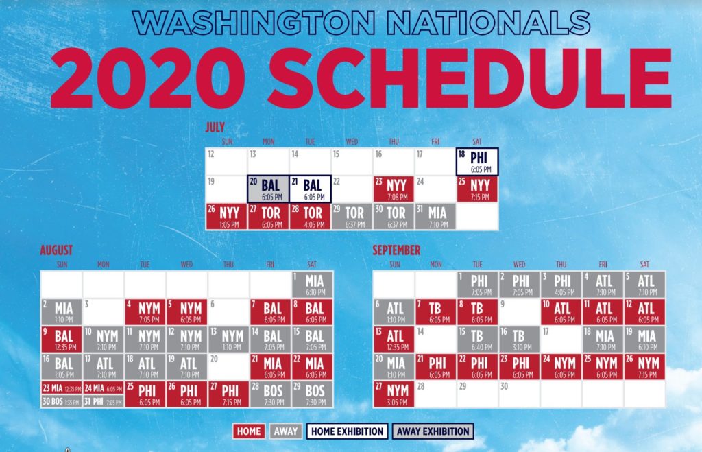 “The Washington Nationals – in conjunction with Major League Baseball – announced their 60-game 2020 schedule on Monday, along with a three-game exhibition slate. The 16th season of Nationals baseball will commence with an Opening Day matchup on ESPN against the New York Yankees at Nationals Park on Thursday, July 23rd at 7:08 p.m. ET.