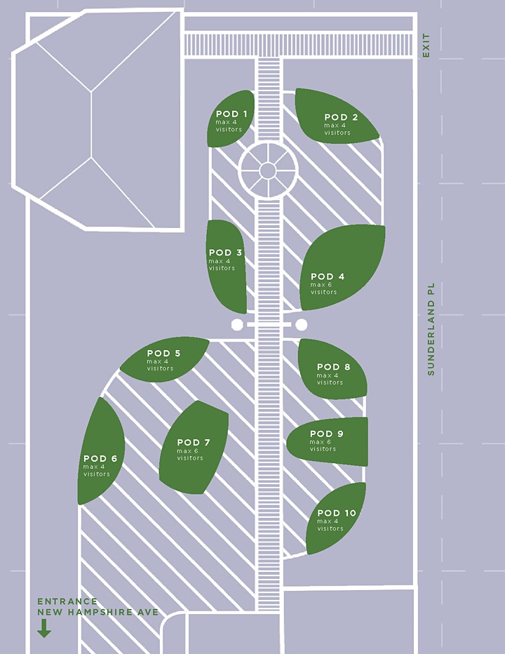 A pod is a specific area of mowed lawn in the garden designated for your group only – we have measured them out so they are at least 6 feet from other pods and the common walkway. Some pods contain shade and some are in full sun. Size varies, with some pods accommodating up to 4 visitors, while others are large enough for 6 (refer to pod map below).