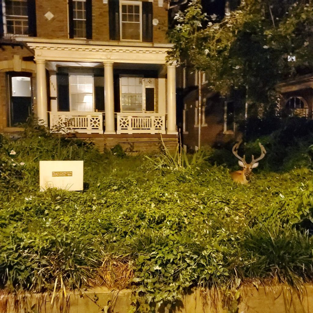 “Deer with velvet antlers relaxes on Biltmore St. last night next to a sign that reads: