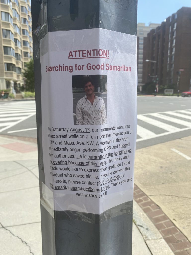 On Saturday August 1st, our roommate went into cardiac arrest while on a run near the intersection of 13th and Mass. Ave. NW. A woman in the area immediately began performing CPR and flagged down authorities. He is currently in the hospital and recovering because of this hero. His family and friends would like to express their gratitude to the individual who saved his life. If you know who this hero is, please contact (203)-308-3254 or [email protected]. Thank you and well wishes to all!”
