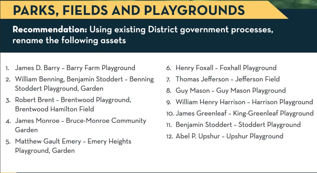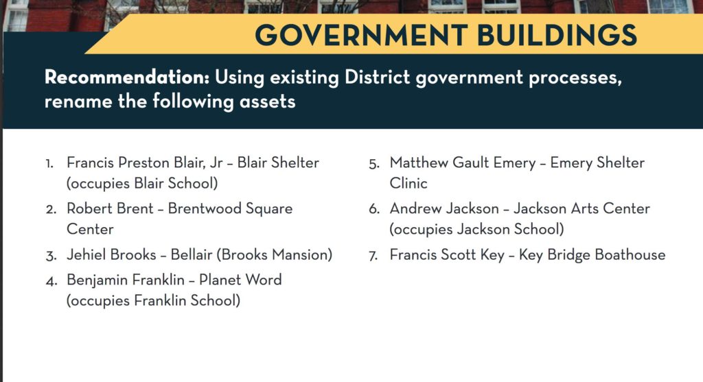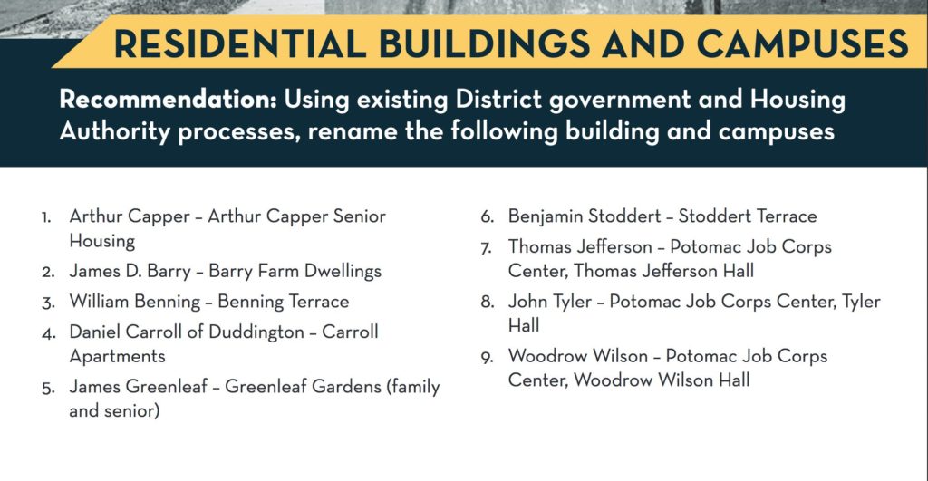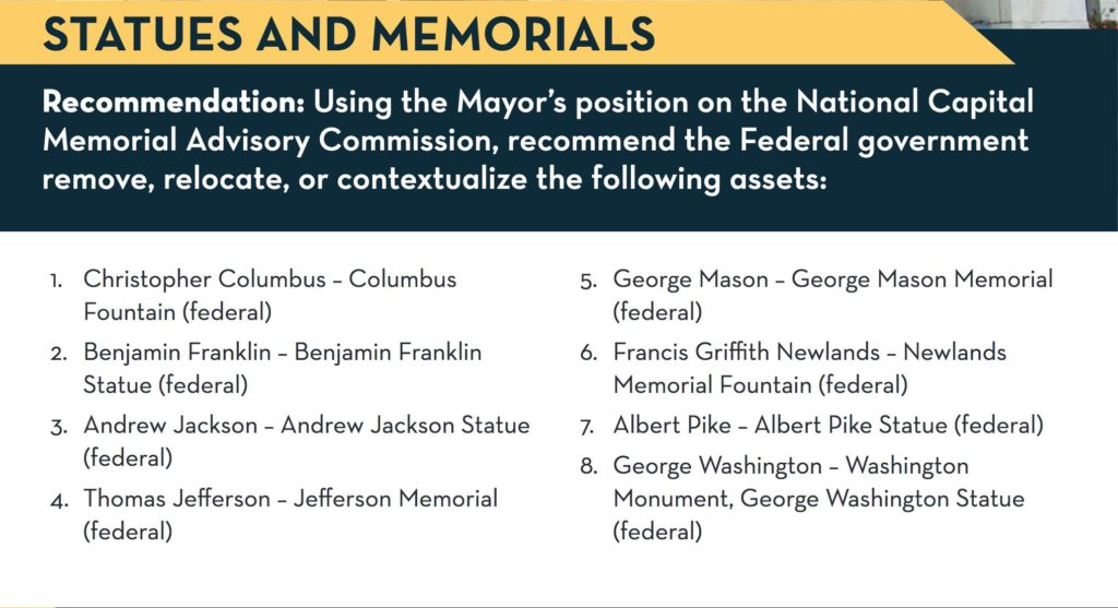 “Across the country, communities are reflecting upon the systemic racism which has been engrained in our culture through policies and expressions impacting African Americans and other groups subject to discrimination,” said Senior Advisor Perry. “This week we delivered recommendations to assure our assets in contemporary DC reflect concurrent DC values.”