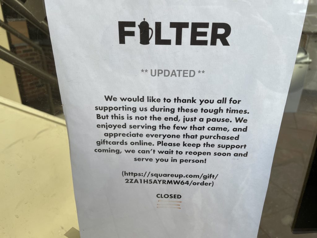 A friend walked by Filter and he told me the espresso machine and most of the stuff inside was gone? Are they closing? moving? I know they have been closed since the beginning of the pandemic, with that part of town with very few workers, nothing would surprise me.”