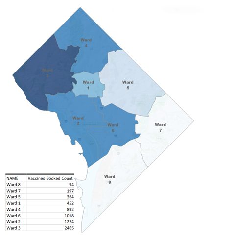 To ensure an equitable distribution of the vaccine, on Saturday, January 16, appointments are only being made available to residents in the five wards that had the fewest number of residents make appointments on Monday, January 11 (shown in the figure above).