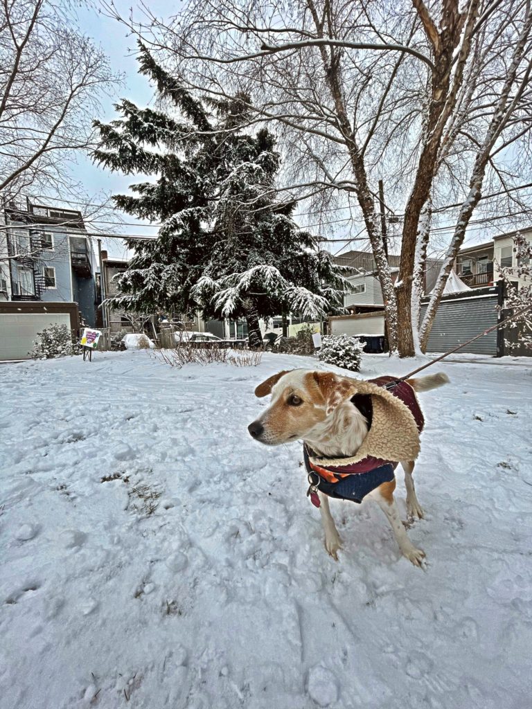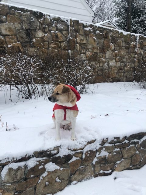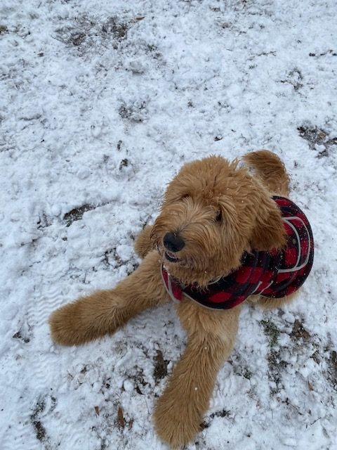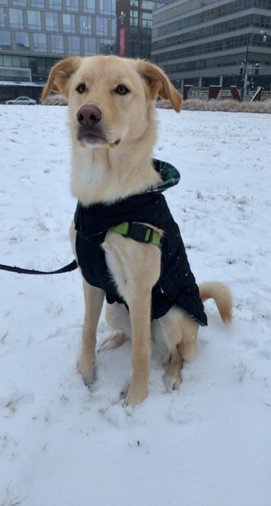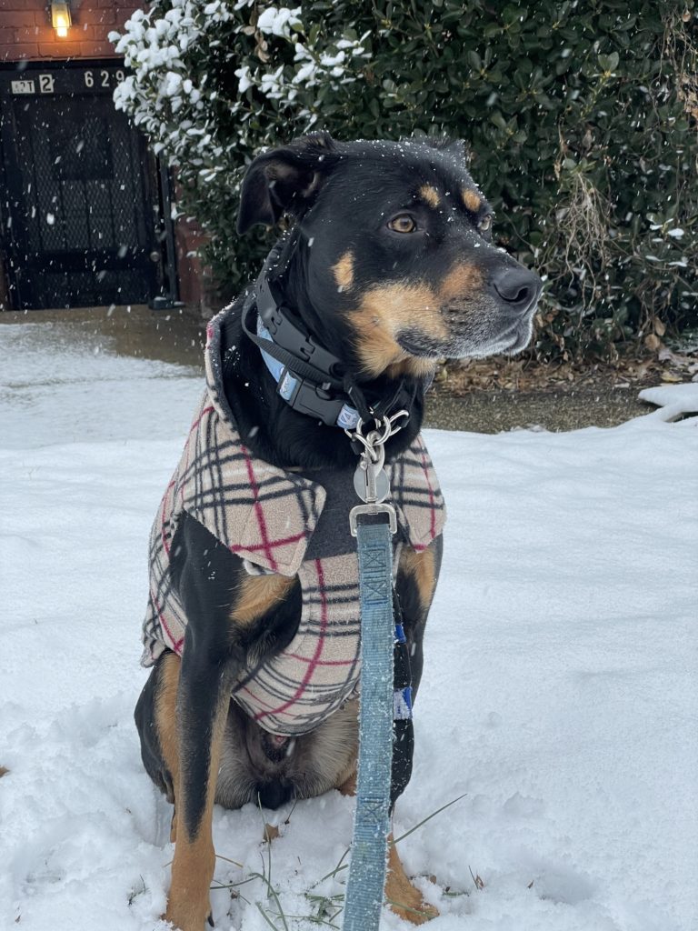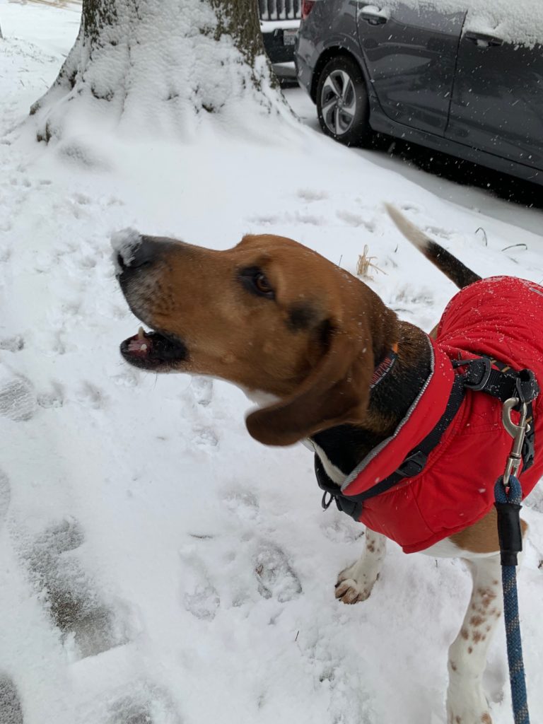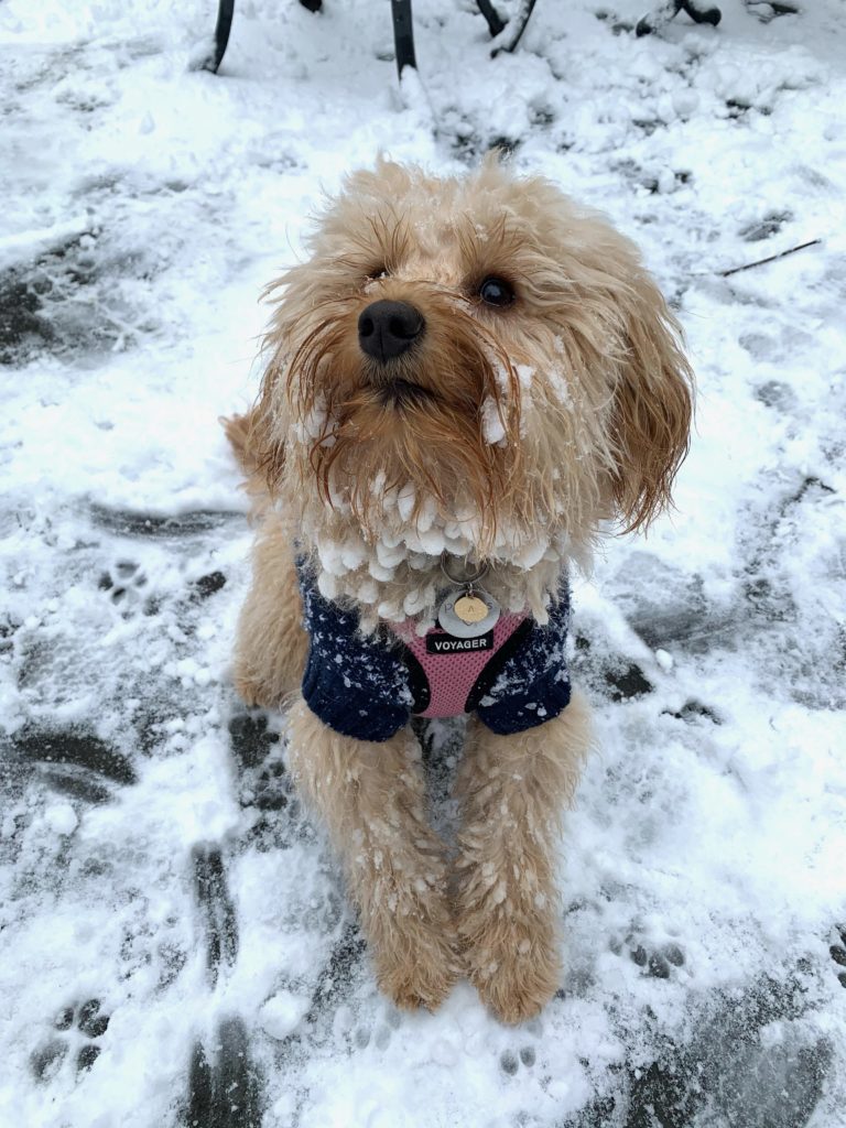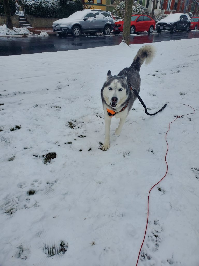 “Sammy from Kalorama during his first snow as a quaran-pup”