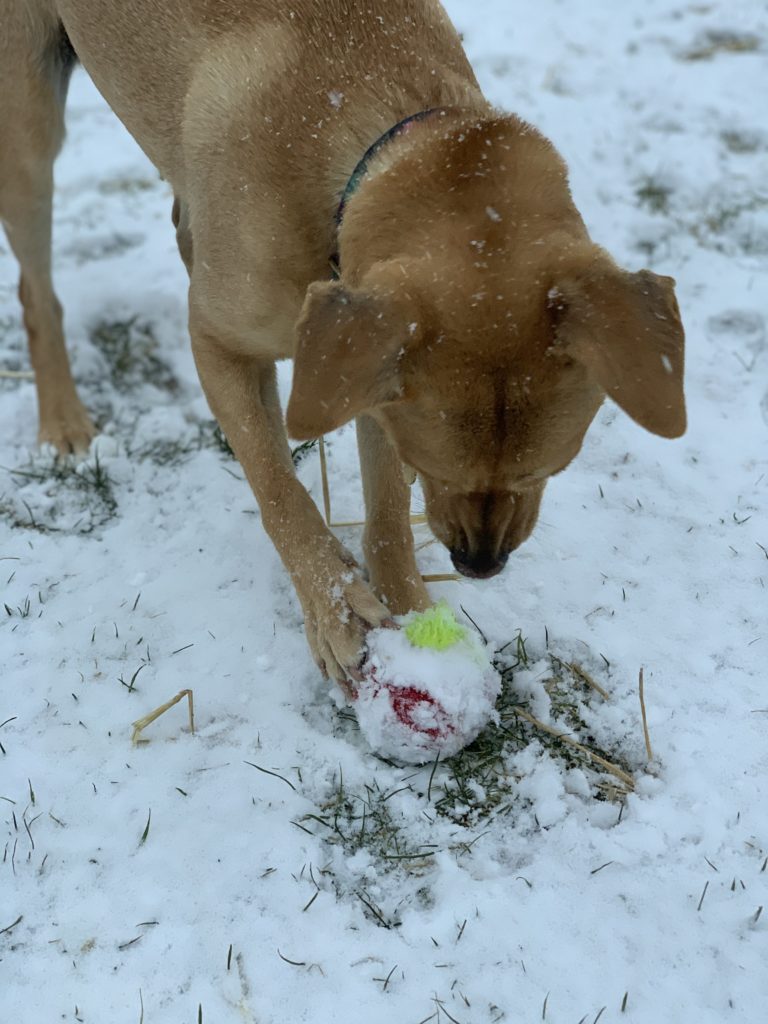 “Stella is enjoying her first ever real snow, and is shown here making a snowball!”