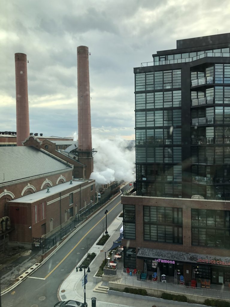 What is the building with two tall smoke stacks at the western end of the actual Navy Yard, just across from La Famosa? For the several weeks I have lived nearby, there has been nothing to see here. Now, for the second day in a row, there is a huge amount of smoke coming out at the bottom of the building (not even out of the smoke stacks) and a very loud whir of machinery.