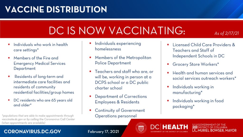 “Today, Mayor Muriel Bowser and DC Health, led by Dr. LaQuandra Nesbitt, announced that beginning on Thursday, February 18, individuals who work in four categories will become eligible to book vaccination appointments through vaccinate.dc.gov or by calling the District’s coronavirus Call Center: individuals who work in a grocery store setting, health and human services and social services outreach workers, individuals who work in manufacturing, and individuals who work in food packaging (e.g. persons who work at Food & Friends and other similar facilities).