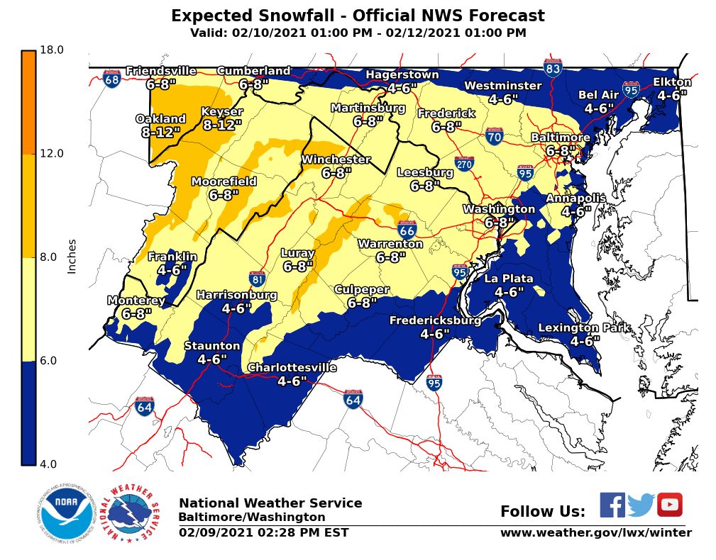 From AlertDC: “The National Weather Service has issued a Winter Weather Advisory for the District of Columbia, which is in effect from 7PM this evening until 10AM on Thursday, February 11, 2021. A total snow accumulation of 1-3 inches is expected.