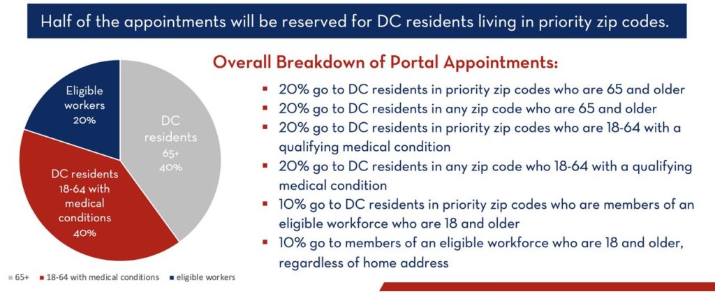 “DC will launch a pre-registration system for making vaccination appointments on Wednesday, March 10 at the link below or through the COVID-19 Call Center at 1-855-363-0333. If you are in an eligible population, you may be contacted via email or phone beginning Friday, March 12 to book one of the 14,680 appointments being made available through the portal and call center. Due to limits on available appointments, it may takes weeks for you to receive an invitation to book an appointment.”