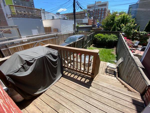The rowhouse includes a washer and dryer, a fully-stocked/equipped kitchen, central AC/Heat, an alarm system, and a backyard with a deck + table + grill perfect for cookouts. The common areas have exposed brick, wood floors, and are fully furnished.