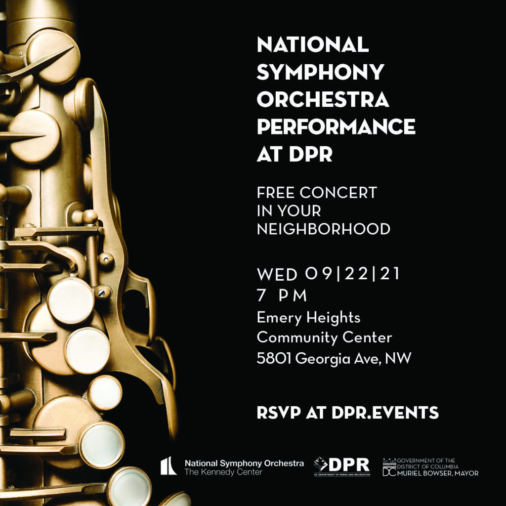 “Come get a taste of the Kennedy Center in your backyard as the National Symphony Orchestra takes over DC Department of Park and Recreation’s Emery Heights Community Center! This is a partnership with NSO’s “In Your Neighborhood” concert series.