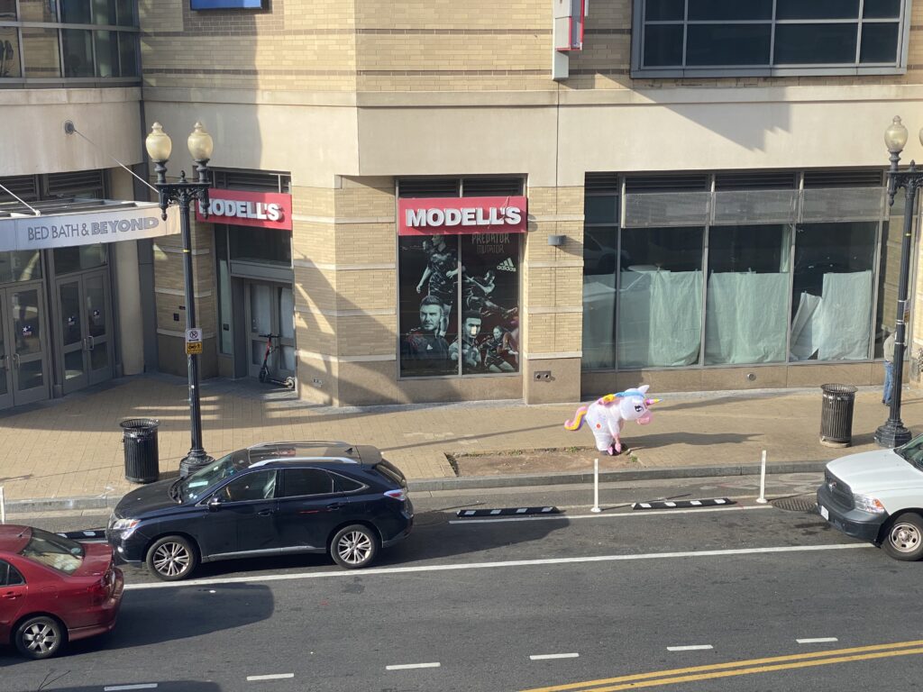 Thanks to Sim for sending: “Even went so far as pretending to eat the tiny patch of grass in front of the shuttered Modell’s.”