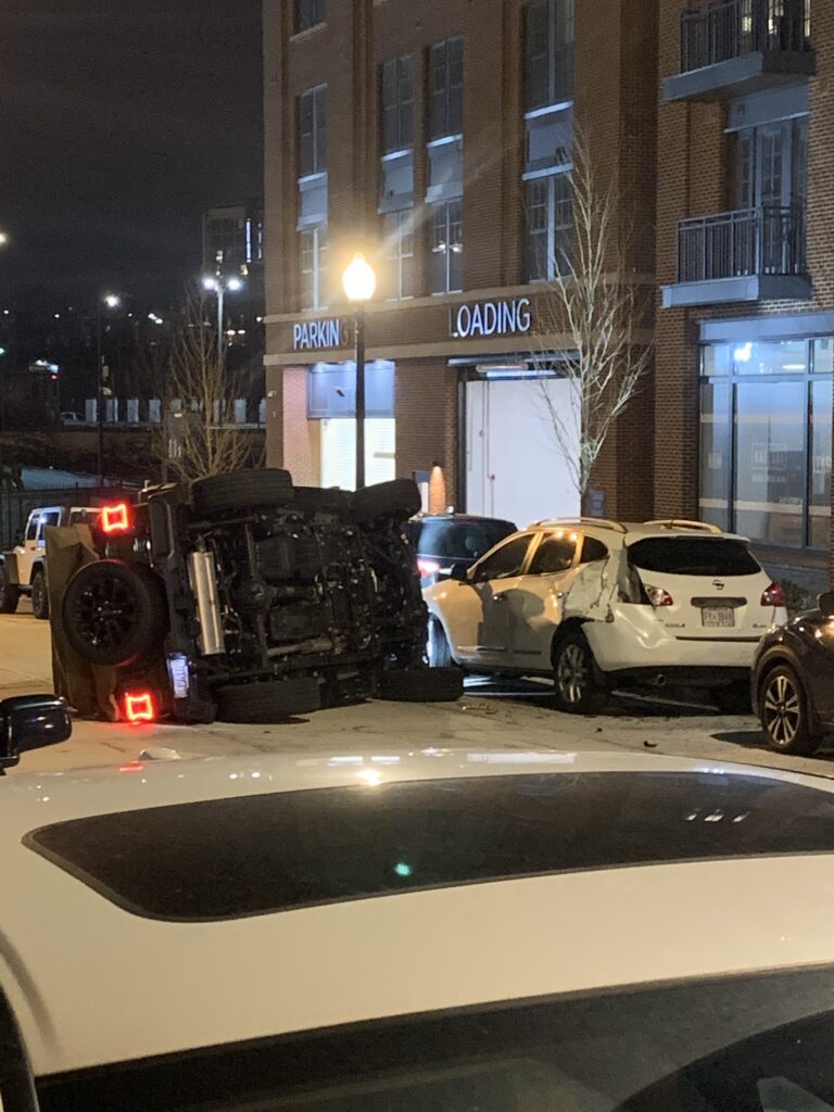 Friday night around 2am my friend was looking for a parking spot by my home. Guy behind us kept flashing his high beams at us – got inpatient and then floored it across Harry Thomas Way/3rd st. He then hit 4 parked cars and flipped his own car.