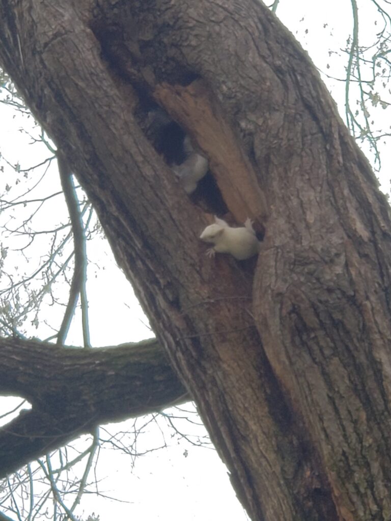 Thanks to Fu for sending: “went out for a walk at The Mall and looked up at my usual spot with the local albino squirrel, lo and behold, a nest of baby squirrels!”