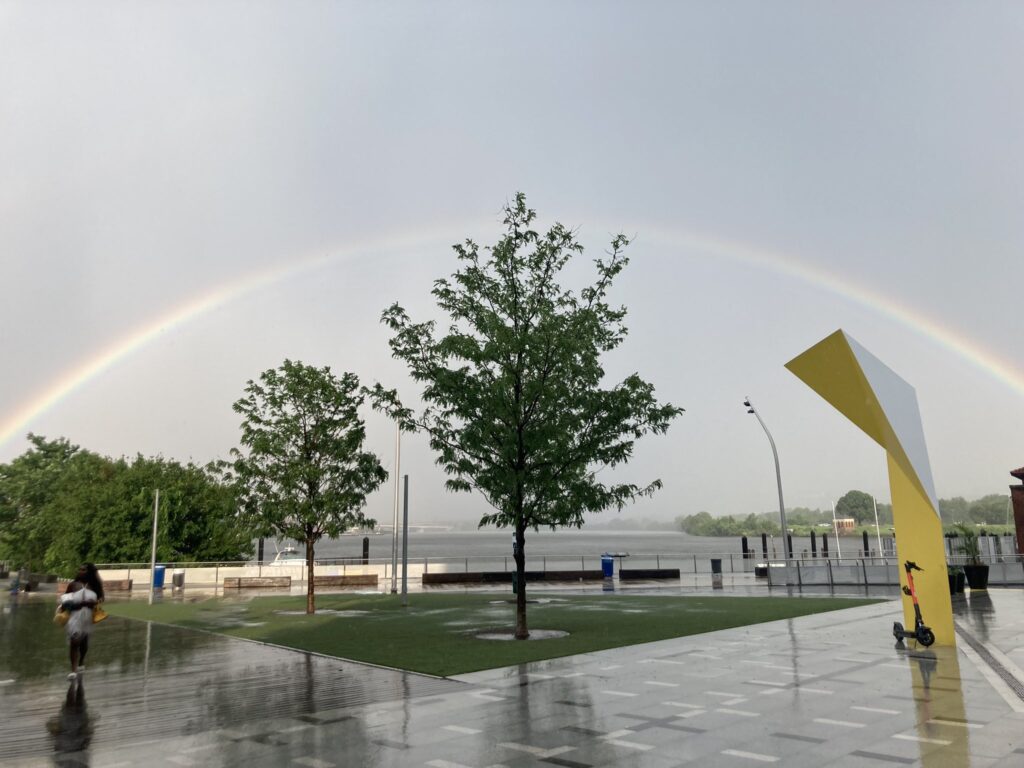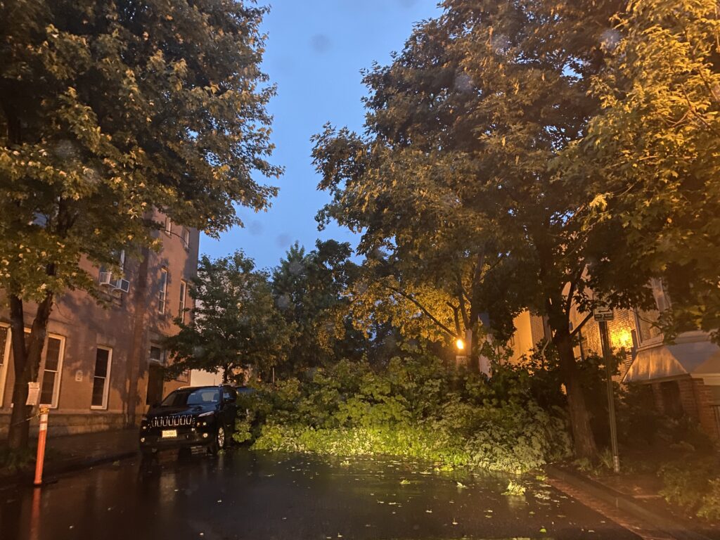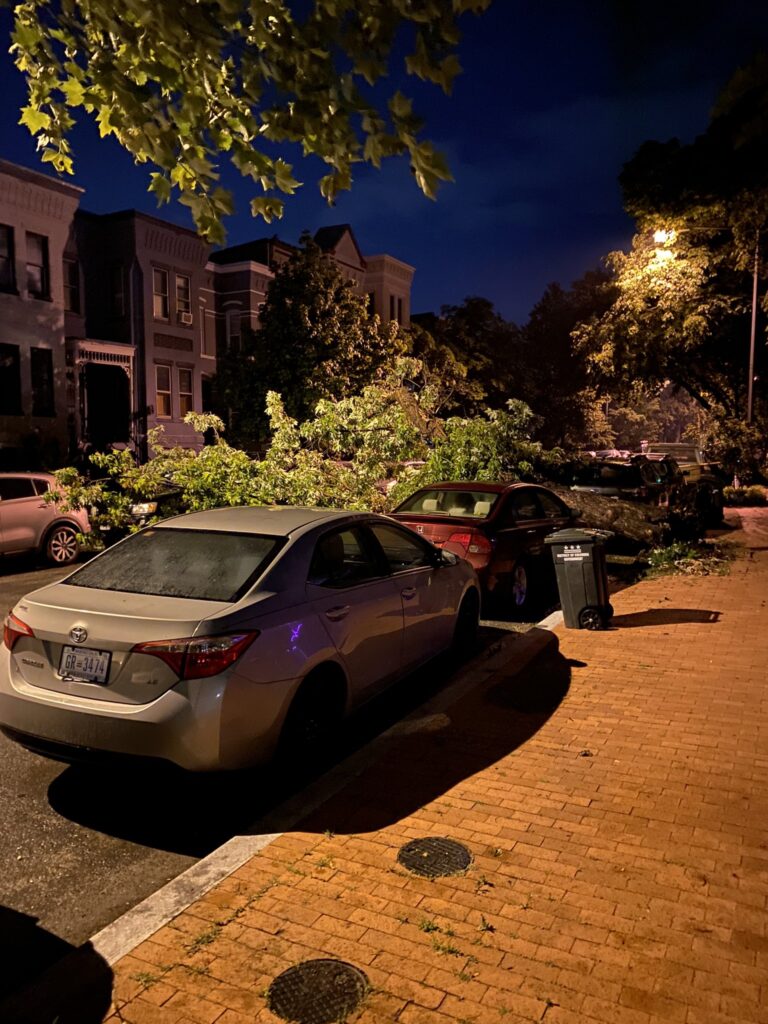 Thanks to David for sending: “Just north of Lincoln Park on 12th st NE. A tree snapped in half from our brief (but strong) storm. The Prius behind it got lucky and it looks like the tree missed it. The Infinity wasn’t as fortunate.”