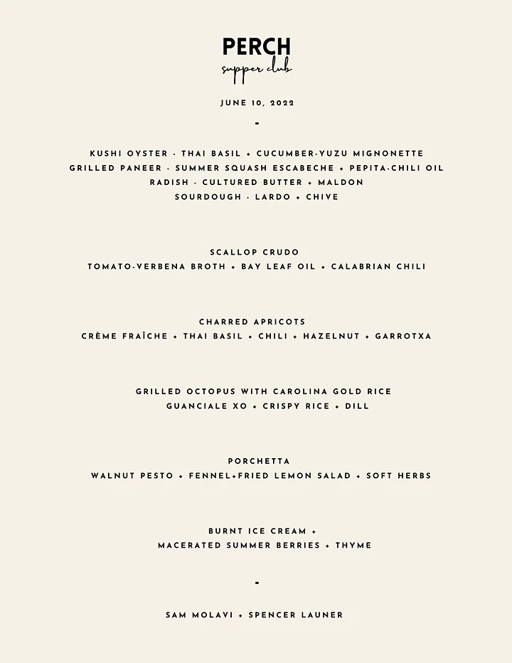 “Perch Supper Club is a new & intimate dining experience in Washington DC from Chef Sam Molavi and Spencer Launer. Each dinner will pair seasonal ingredients with delicious wine and intriguing conversation. All proceeds will go to non-profits that are changing the world.