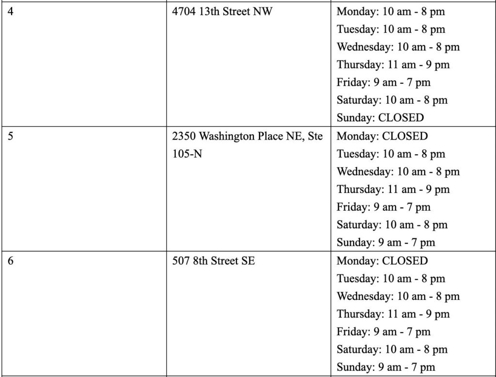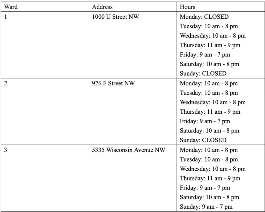 The COVID Center schedule for next week, adjusted to have all eight sites open on Tuesday, is below. Residents should note that the new Ward 1 location at 1000 U Street NW (which is replacing the previous location on Euclid Street) opens on Tuesday, June 21. Participating vaccine locations will also be listed on vaccinate.dc.gov.