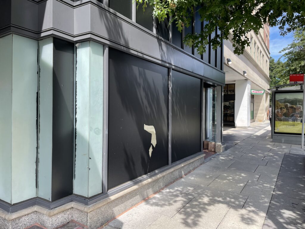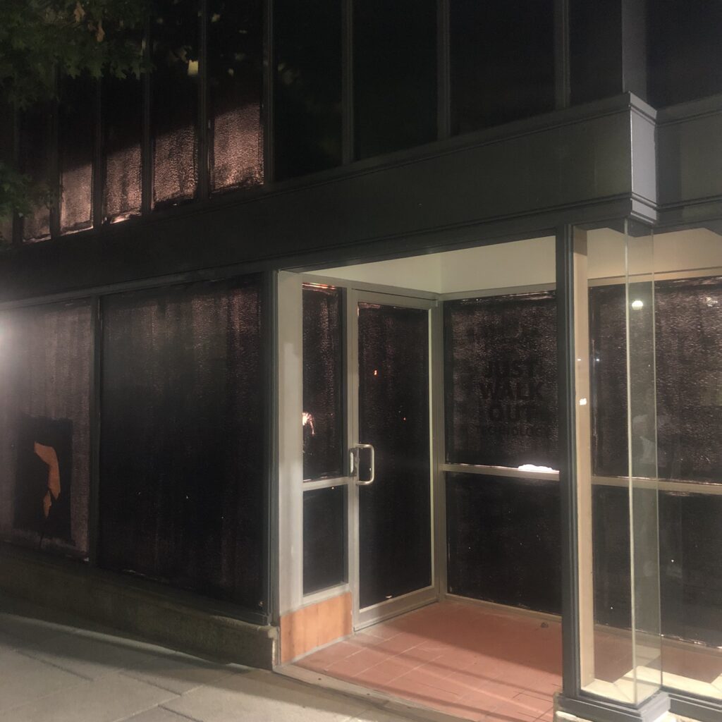 I went past the old Panera spot at Dupont, and with the lights on inside and it being dark outside, I could read the window that’s papered over. Photo underneath- it says Just Walk Out technology on it. Maybe becoming one of the Amazon supermarkets?”