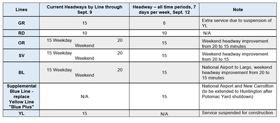 Metro will announce new schedules (see below) for all rail lines. For customers who may be returning to Metro this fall and have questions about the service, Metro recently extended its customer service hours to provide more real-time information online or by phone Monday through Friday from 7 a.m. to 8 p.m. and on weekends from 8 a.m. to 8 p.m. Metro’s customer service team responds to Twitter, Facebook and Instagram social posts, emails and chat conversations. Customers also can get assistance with trip planning by calling 202-637-7000 or visiting wmata.com.”
