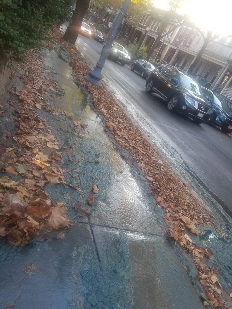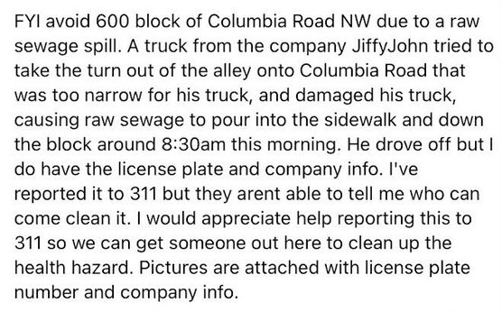 There’s a literal river of $h!t running down the sidewalk of the 600 block of Columbia Rd NW. It has been reported to 311, but no indication of when the department of sanitation will come out. Note below is from the Park View Beautification Crew‘s Facebook page.