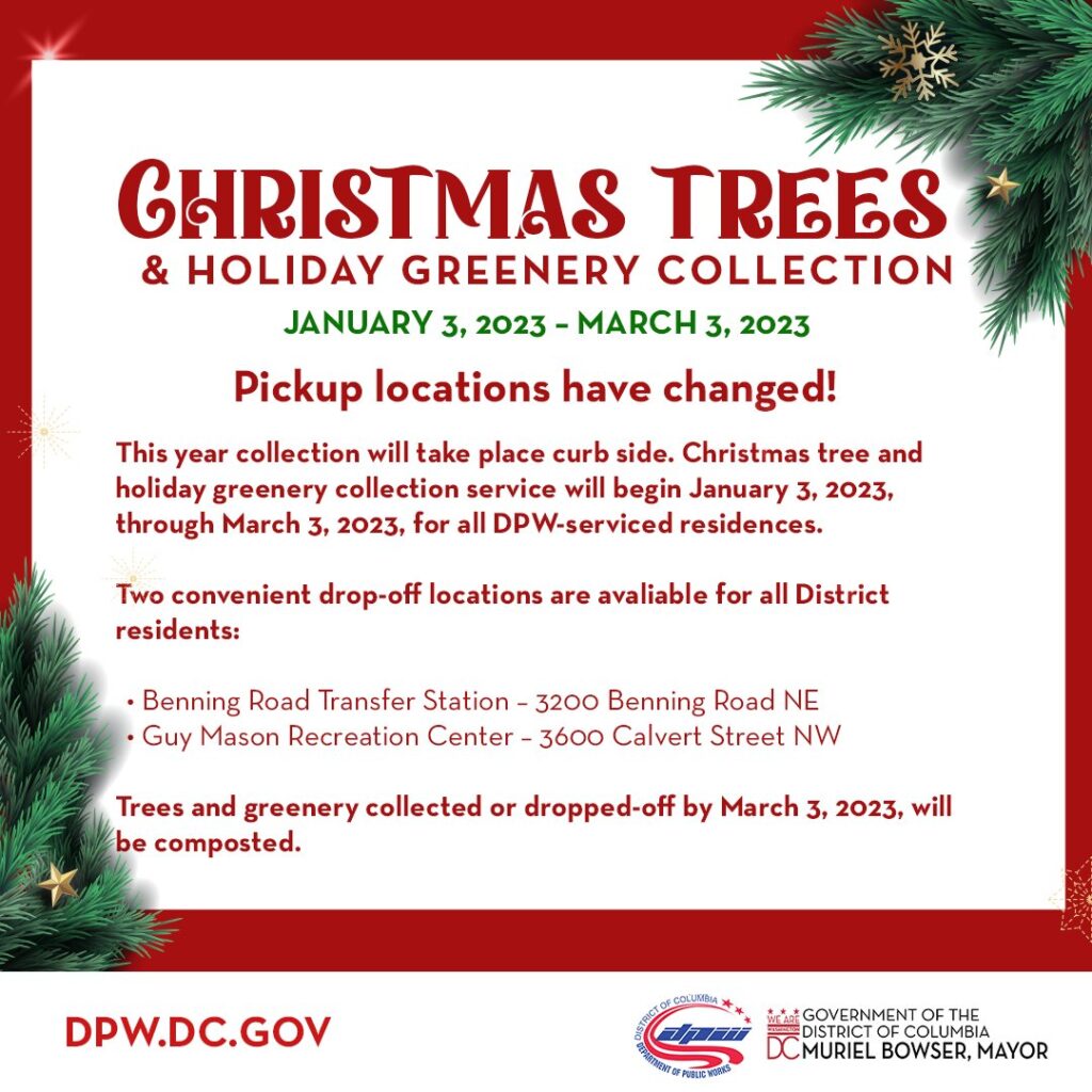 “Christmas trees and greenery are some of the ways we beautify our homes during the holidays,” said Interim DPW Director Michael Carter. “The holiday tree and greenery collection program provides an opportunity to reuse tress and greenery for composting, which furthers Mayor Bowser’s Zero Waste goals.”