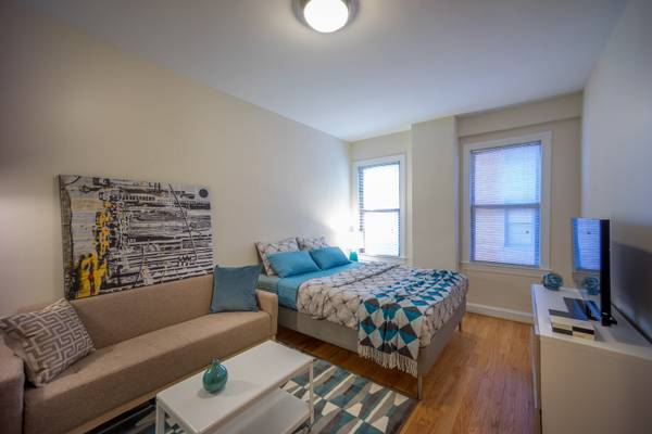 This sun-filled unit offers an open floor plan with a kitchenette, stylish new granite countertops, stainless steel appliances, a W/D-in-unit, closet with custom closet organizers, cable/high-speed internet access, and beautiful hardwood floors throughout.
