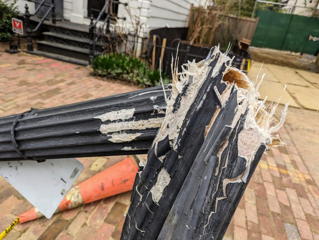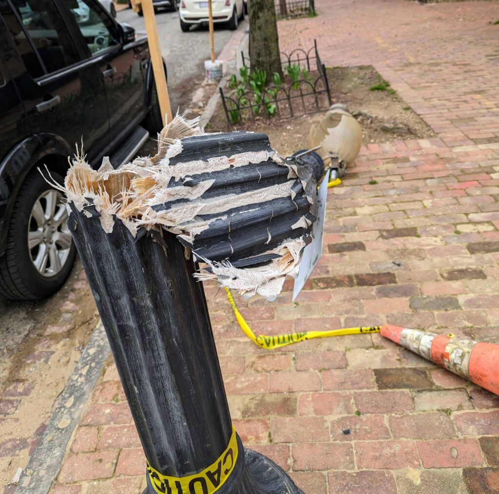 I’ve seen a few of these knocked over before, but never snapped in half like a pencil. In case you ever wondered what the inside of a DC street lamp looked like, now you know. 30th Street in Georgetown.”